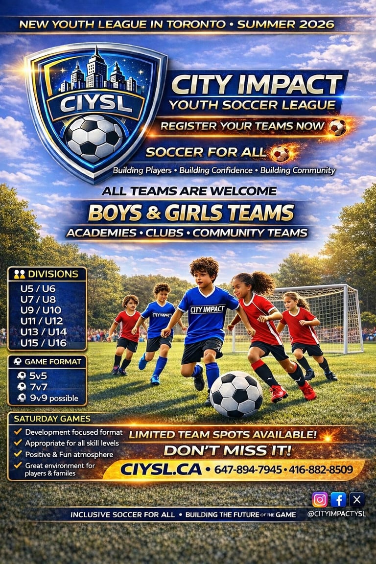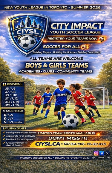 The City Impact Youth Soccer League (CIYSL) is a new community-based youth soccer league in Toronto focused on development, participation, and creating a positive environment for young players.